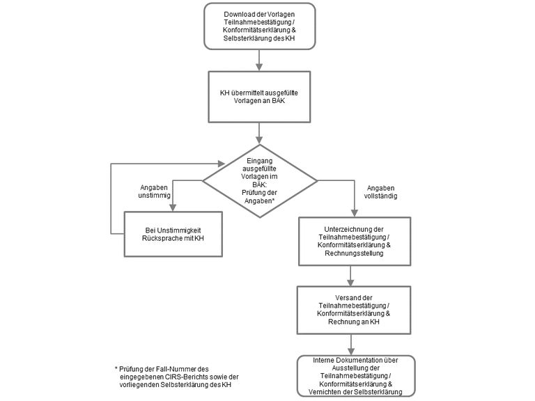 - Die BÄK prüft die Existenz eines CIRS-Berichts zu der angegebenen Fall-Nummer im CIRSmedical.de und das Vorliegen der unterzeichneten Selbsterklärung.